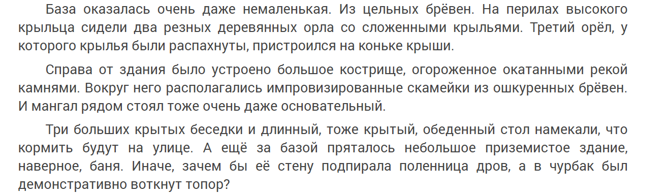 Также и в этой книге, на мой взгляд, промежуточный финал, предусматривающий продолжение. Ведь читатель так и не узнал тайны Климента, а у него она точно имеется. Да и какие события еще произошли в летнем лагере «Орлиное гнездо» после того, как он его покинул. Как понимаю база с таким названием действительно существует и расположена рядом с рекой Катунь. Даже в интернете смогла отыскать.