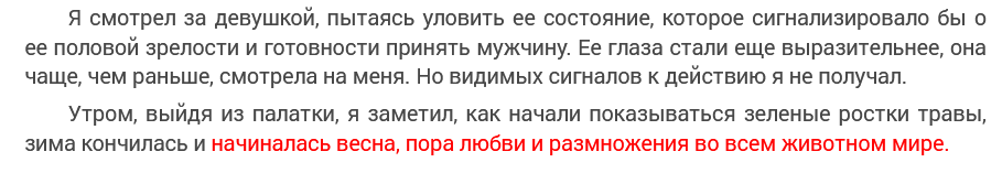 Не знаю, как обстояли дела в племени луома с сексом, эту тему я не затрагивал, но Нел вела себя так, словно этого явления вообще не было в природе. Несмотря на дикое желание, мне приходилось терпеть, ведь это был совсем ребенок порядка четырнадцати лет. Один раз я предпринял попытку поиграть с ней в воде, но девушка вырвалась и очень долго