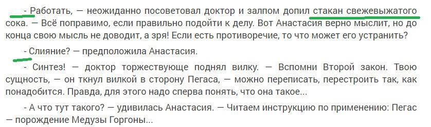 «Стакан свежевыжатого сока» тут несколько не к месту. Было Концентрация сцены на разговоре и сути ПЕгаса, и тут было бы разумнее просто мимоходом заметить. что доктор допил сок. Эти вот уточнения, что именно стакан. не кубок и не фужер, и сок свежевыжатый — отвлекают от сцены и придают излишнюю болтологичность. Это замечание системное. При всем грамотном изложении и общей организации, вот такие «витиеватости» утяжеляют и сбивают фокусировку момента.