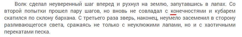 1. Скорее всего, в данном отрывке автор сталкивается с нехваткой синонимов, поэтому вместо слова «лапы» использует «конечности», что, в принципе, верно, но слегка выбивается из стиля. Можно заменить так: «Со второй попытки прошёл пару шагов, но вновь потерял равновесие и кубарем скатился по склону бархана».