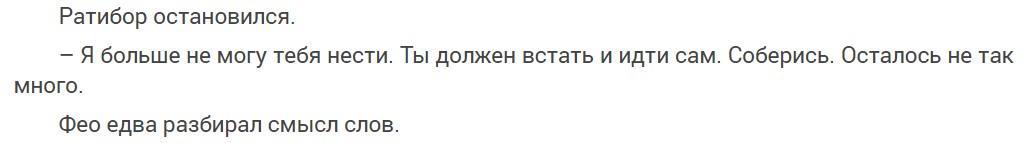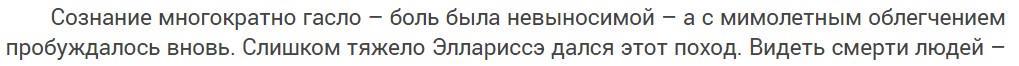 Отсутствие объяснений ведет к тому, что я не всегда понимаю, что происходит в книге. А вот еще немного настоящей магии! Два героя (Фео и принцесса Ситинхе) ни слова не сказали, но друг друга поняли. Он увидел готовый завтрак и гадал, принцесса принесла его или нет. На низком столике уже ожидал завтрак - горячий хлеб, печеное мясо и сыр. Фео с недоумением посмотрел на Ситинхе. Не верил, что это она принесла. Принцесса угадав его мысли, покачала головой. Еще бы она несла, второе лицо империи, а слуги для чего?  Его мысли были в том что он не верил, что это принесла она. А она качает головой - отрицание. Принесла не она. Значит, не угадала не фига! Думала, что он на нее подумал, а нет. В другой главе Фео спас принцессу и сам остался жив, но был в плохом состоянии. его схватили эльфы и начали лечить. Один схватил его за подбородок и, оттянув нижнюю челюсть, влил что-то в рот. Голова Фео стала тяжелой. Хотелось лишь упасть. Где-то в глубине души еще горели остатки воли, и Фео шептал имя Эдельвейс, пока тьма не погасила сознание. Главное, как герой глотает то, что ему заливают, в тексте нет. Как же он тогда шепчет ее имя с полным ртом какой-то гадости? Вот это настоящая магия! И еще немного из момента спасения: Кровь залила глаза, рот, ворот, но Фео о себе не думал. Вслепую он нашел Эдельвейс, и сердце его едва не разорвалось: под головой принцессы растекалась лужа. Как он увидел лужу под головой если кровь глаза залила? Он же не видит ничего и вслепую ее нашел. Магия?