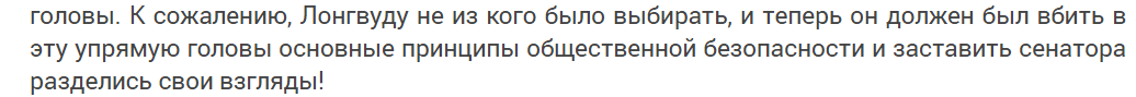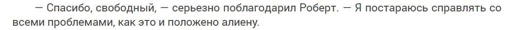 Забавно выглядят подозрения сенатора Томпсона, что Роберт шпионит на Службу адаптации, несмотря на быстрый набор им баллов для того, чтобы стать свободным. Вообще к этой Службе тоже есть вопросы, особенно к Райту, но авторское объяснение, что это «специалист высокого уровня» с «ограниченным кругозором» сразило меня наповал, осталось только понять Райта и простить).