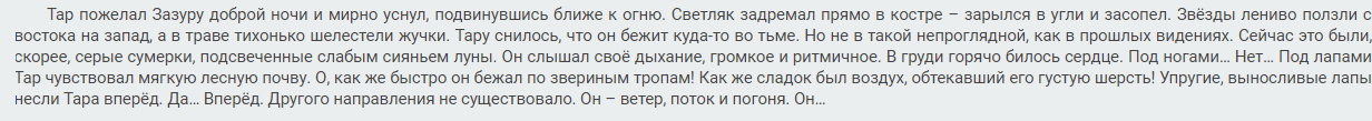 У автора несомненно «душа поэта» И кто любит и умеет ловить кайф от красивых и грамотно поданных слов, получит настоящее, эстетическое наслаждение. Текст для гурманов, я бы сказала. Ну, а кто ещё не устал от упрощенных вариантов сетературы, всё равно найдет здесь интересную историю. Потому что, читается это легко и приятно.