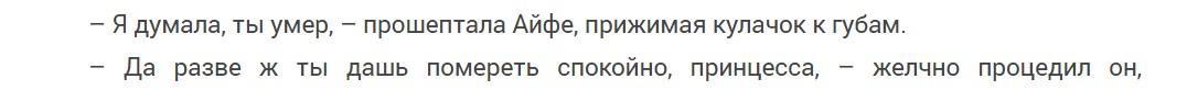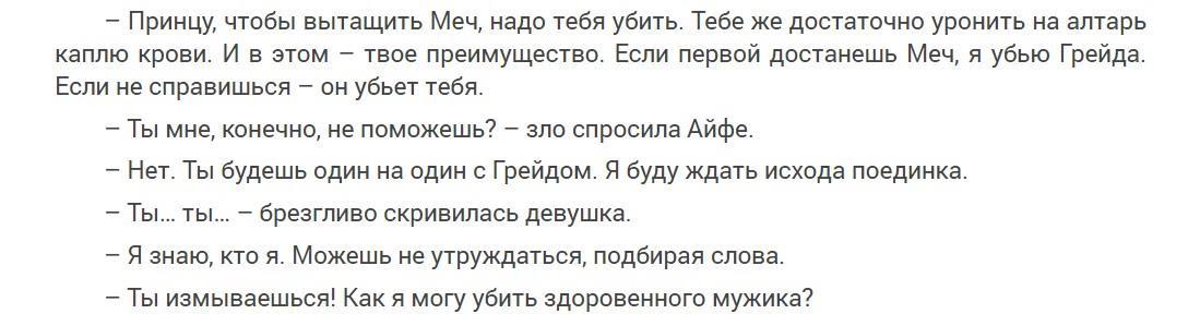 Здесь я что-то не совсем понимаю логику. Айфе нужно же достать меч - почему она говорит о том, что ей не под силу убить принца? И Хин тоже говорит про её поединок с принцем, хотя пообещал убить Грейда.