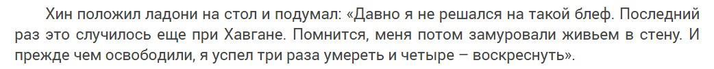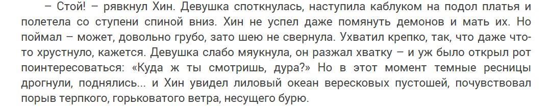 Хин – личность ещё более сложная. Помимо ужасного заклятия, он тащит на себе тяжёлый груз вины за легкомысленное отношение к человеческим жизням, завоевание чужих земель, результатом чего явилась потеря своей. В начале романа это просто смертельно уставший и озлобленный на весь мир человек, который ради своего собственного освобождения от рабства не остановится перед тем, чтобы принести в жертву невинную девушку. А дальше – всё опять непросто.