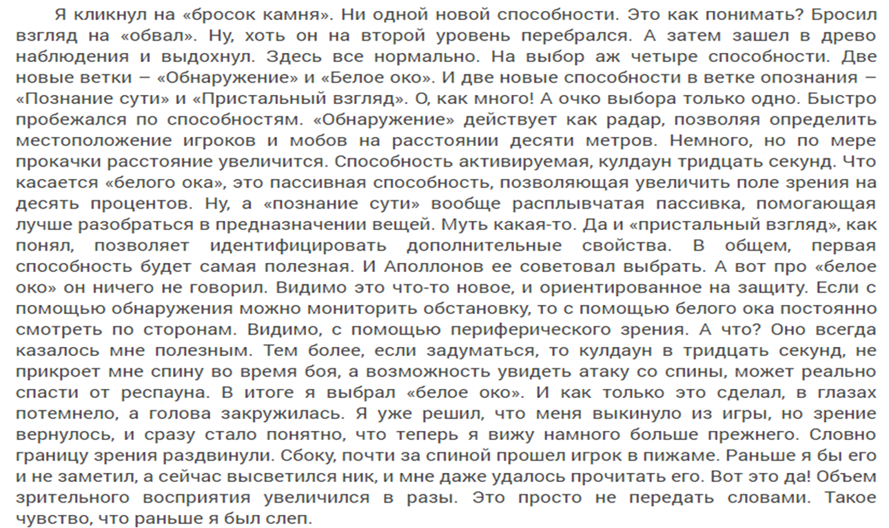 Я, наверное, не преувеличу, если скажу, что на 80% текст состоит из описаний того, как герой прокачивает и изучает новые способности, а так же из его мыслей по этому поводу. Если всё это убрать, объём можно сократить вдвое. А пока на каждом шагу приходится читать вот такие абзацы: