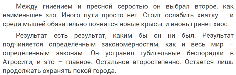 Вот этого качества и лишен Атрокс: после стольких лет бесплодной борьбы с - или пирровой победы над? - хаосом он действует на автомате; его внутренний стержень - столь милый и понятный мне рационализм - к этому времени изрядно погнут и готов надломиться.