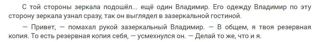 В чём-то роман традиционен, в чём-то оригинален. Вроде бы в фантдопе редко встречаются «резервные копии» персонажей, и сама по себе идея неплохая, однако в данное произведение она вносит некоторую неразбериху: вот у нас главный герой Владимир, у него в голове время от времени возникают мысли другого Владимира – его двойника из параллельного мира, который с ним как бы слился, а в Зазеркалье есть ещё какой-то Владимир, вроде как резервная копия, при этом туда может ходить через зеркало и первый Владимир, короче, все всё поняли, да?)