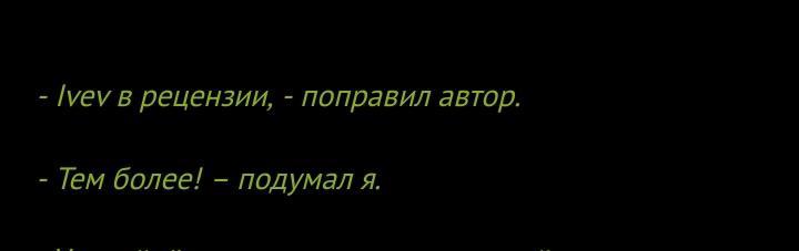 Нет, я все понимаю, для вас читатели может это и не важно, но для меня это значит, что автор пусть и пока (надеюсь что пока) только один, настолько высоко оценил мою работу, что по сути увековечил меня в своей книге. Это потрясающе, правда, у меня нет слов. Ну, то есть, они есть конечно, но их слишком много и они вряд ли передадут всю гамму чувств, что я испытал увидев эти четыре быквы. Вы просто представьте, вот вас... Да, да, именно тебя, того кто это читает прямо сейчас. Возьмут за ваши труды в начале вашего пути и оценят, пусть это будет просто незнакомая бабка увидевшая как вы играете на гитаре на улице или водитель такси узнавший вас, как блогера и похваливший за интересный контент, или ваш ребёнок уже подросший, как нибудь придёт к вам на работу, увидит, что вы сделали не зная, что это ваша работа и искренне вам будет рассказывать как ему понравилось то что он увидел, или даже знаменитый архитектор увидел ваш чертёж и план, удивился и сказал: "Вот, посмотрите. Это работа профессионала". Конечно примеры возможно не слишком удачны, но они замечательно отражают суть. Возможно сильные эмоции заставляют нас выгорать, ну и плевать, мне отрадно знать, что минимум один человек может с гордостью (ну или просто с доброй улыбкой) сказать, что для меня однажды написали рецензию, это сделал один молодой начинающий рецензор и её было интересно читать, возможно вы слышали, его зовут Ivev. Ну и в этом духе. Фуух! Радостью поделился, поговорим же о книге (надо было сразу о ней, но прошу простить эмоции просто динамит).