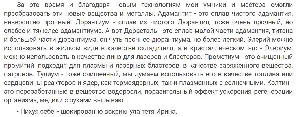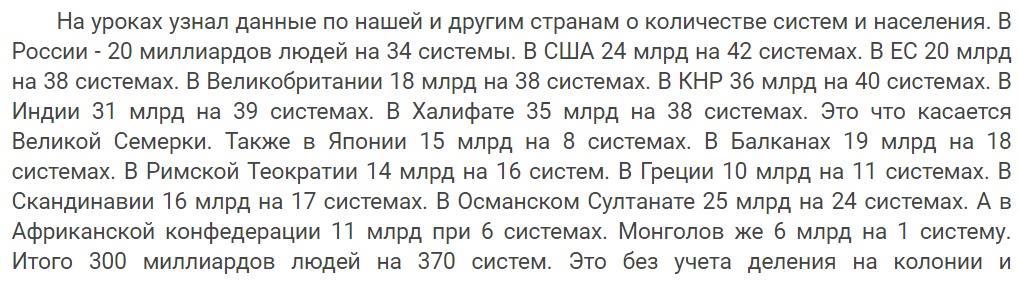 В той же второй главе есть куча совершенно ненужного текста про государственное устройство – оно не фигурирует больше нигде и в целом не несет никакого смысла ни со стороны важности для фика ни как отдельная система. Оно упоротое от начала и до конца, его даже сколь-нибудь всерьез невозможно воспринимать, это набор бессвязных слов и предложений. Если попытаться всю эту лабуду структурировать, то не получится ничего, в ней отсутствует рациональное зерно, отсутствует элементарный смысл. Есть просто набор из слов «армия», «экономика», «реформы», их синонимов и кучи дореволюционных наименований должностей. Автор не задумывается, как оно вообще будет работать, не углубляется в тему, чтобы понять хоть примерно, как это может быть. Ему некогда, он просто строчит и строчит нечто упоротое, напоминающее бездумно вырванные из контекста кусочки школьного учебника по истории, и вставленные в какую-то отсебятину из безумных фантазий. Описанное устройство Российской империи начиная с XXI века отдаленно напоминают некую дико упоротую автаркию – по изложенной в тесте мысли автора, добытые ресурсы очень выгодно складывать на складах и побольше, побольше. Продавать их за рубеж невыгодно, и этого не делают. Вот такая вот успешная экономика.