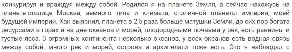 Внятного сюжета, ну, как бы это сказать, нет. Серьезно – нет. Фанфик состоит из описаний упоротого государственного устройства космической Российской империи; сцен, где окружающие одноклеточные восхищаются ГГ; сцен с однообразными беседами о том, какая Российская империя великая; рассказов о том, как сделать ее еще более великой в исполнении ГГ и окружающих его одноклеточных. Выглядит это примерно вот так: