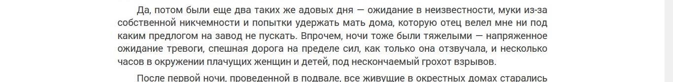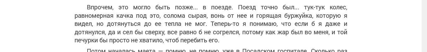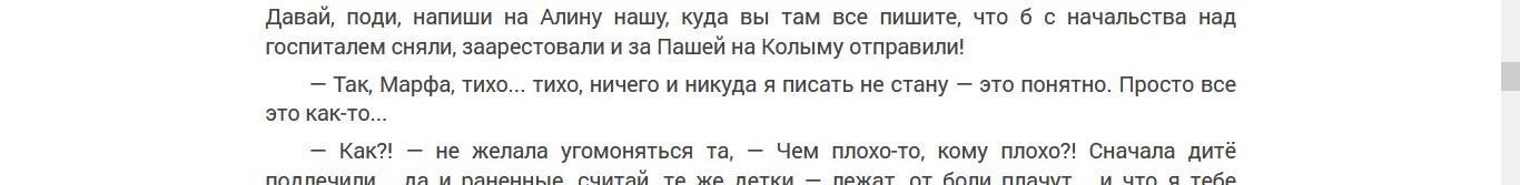 - Не слишком ли сытно едят? Мне покойная бабушка рассказывала, что в войну ели картофельные очистки, жаренные на олифе, а хлеб был за радость и лакомство, получали его по пайкам и тщательно делили до последней крошки. В уже упомянутом «Месте встречи», Жиглов мечтал о супе с потрошками, т.е., с куриной требухой, в послевоенное время, в то время как в книге идёт война, а кормятся все вполне прилично, я не считаю сахара, которым раненые угощали детей в госпитале, но у персонажей есть и сало с картошкой, и пироги с творогом, и куриный бульон, будто селяне того времени жили если и хуже современных, то ненамного.