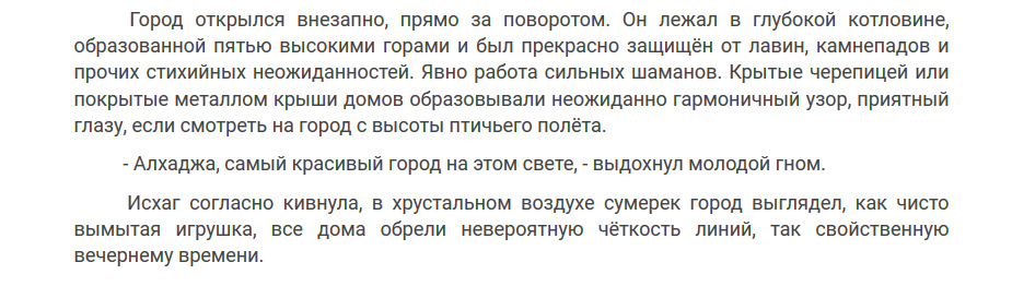 Хорошо, но мало. Нет описаний улиц, обитателей города, рынка, ничего такого. Исхаг и не вспоминает о том, как думала, собираясь путь, что, по слухам, в городах гномов улицы выложены серебряными кирпичами. А ведь должна была бы проверить. Но нет. Только описание дома гнома изнутри. Королевского дворца нет ни изнутри, ни снаружи. Автор решает проблему просто: мой друг живет в крепости. Он пошел во дворец.