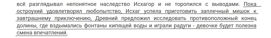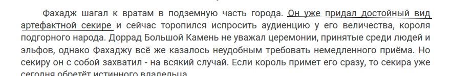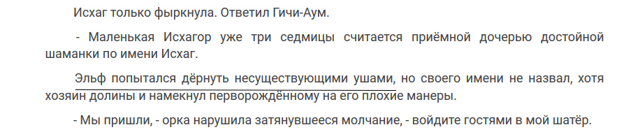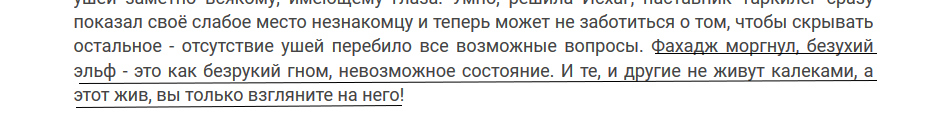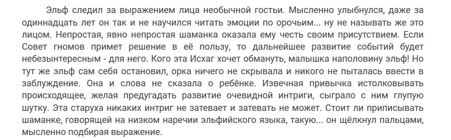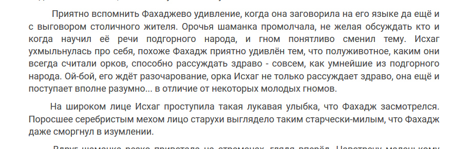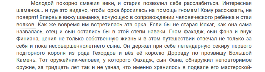 Та же история с внешностью героев. Встречает Исхаг гномов - коротышки, старый и молодой. У старого, правда, есть борода, а молодой, кажется, кудряв, не полезу уже проверять. Эльф - старый и седовласый. Служанка эльфа - полная. Я все понимаю про нежелание навязывать детальное описание внешности, но нельзя же совсем никак? В конце-то появляется описание короля гномов, значит, можете. Да и Исхаг глазами Фахаджа расписана всяко-разно распрекрасно.