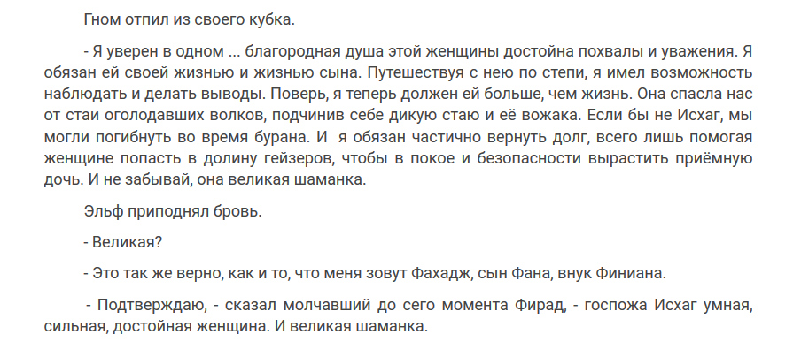 Нет никаких упоминаний о том, что ее наставник побывал в разных уголках мира, рассказывал ей о его городах и обитателях, называл какие-то даже имена, например, глав того самого Совета гномов, к которому она собралась обратиться. Ничего не говорится о войнах, участницей которых довелось быть самой Исхаг. О ее знании языков гномов и эльфов. Все это проявляется в тот самый "подходящий" момент. Встретила гнома - оп! - заговорила на его языке. Гном удивлен, а читатели-то как!.. Приехали в дом к главгаду эльфу - та же история. Пришли в гномий Совет - обращается к его главам по именам и тоже, конечно же, производит сильное впечатление.