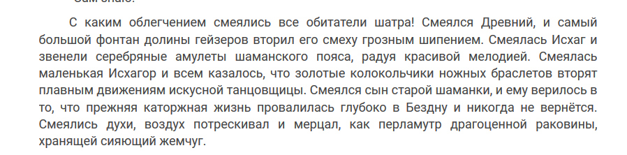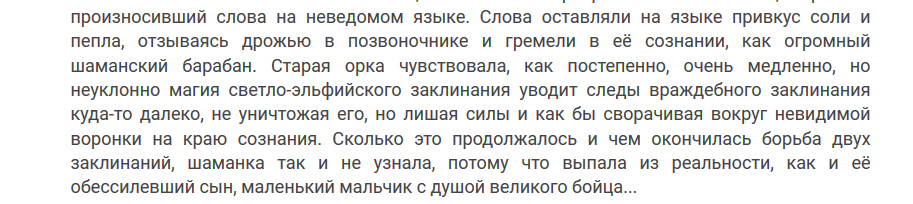 У "Шаманов" очень много положительных отзывов на Самиздате, преимущественно женских. Да и роман-то женский. Мужчинам тут не за что зацепиться: конфликтов нет, войн нет, мордобоя нет, секса нет. Но, может, кому-то и из мужчин понравится, все возможно. Мне на данном этапе роман скорее не понравился, чем понравился. Первую третья я то и дело ругалась на косяки логики и спотыкалась о предложения вроде приведенных в примере. Вторая треть провисла, как я уже говорила, а вот третья хороша. Вычитка роман динамичнее не сделает, но уберет хотя бы часть проблем. А пока текст, на мой взгляд, сыр и недоработан, хотя и имеет свои достоинства.