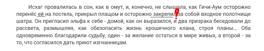 Ну и про видимость-невидимость духов тоже неплохо бы в начале прояснить вопрос, потому что мне вот интересно, как сама Исхаг их ощущает? К середине книги там и цвет у них проявляется и запах, а в начале ничего этого нет. И какими лезвиями во второй главе духи вспороли горло разбойникам, напавшим на гномов? И, да, да, ездовой дух-коврик! Опять описание только в третьей главе, а не в первой, где Исхаг не пойми как на нем переместилась на то место, где были убиты родители девочки. С духом - отцом долины и духом безухого эльфа все ясно, а вот с мелкими прояснить бы пораньше.