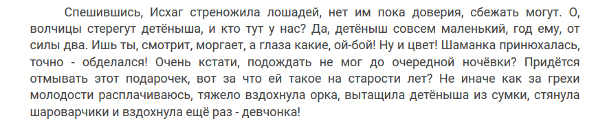 Хорошо бы в самом начале устами Исхаг привести перечень ее заслуг перед кланом. Это ведь стандартная, можно сказать, практика: Я для них!.. Всю жизнь положила, а они!.. Лечила, спасала, благодаря мне роду сопутствовала удача и процветание, мои предсказания всегда сбывались и прочая, прочая. Если так все и было, непонятно, как от нее, такой замечательной свои отказались. Если, как говорится дальше, смена шамана - это традиция (а почему вначале об этом не сказано), чего злиться-то так? Должна была знать, что рано или поздно это случится.