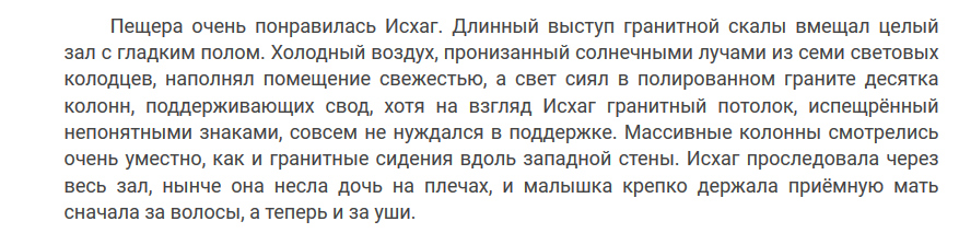 Хватает в романе и менее глобальных косяков. Основные претензии к первой главе. У меня, увы, из-за зависшего компьютера пропала первая версия рецензии, где первая глава была разобрана от и до, но, бегло я по основному прошлась. Из не упомянутого, что помню, опять же навскидку, посох, который вдруг появляется из ниоткуда. Исхаг не брала его с собой, а он в нужный момент тут как тут. И, да, если она так хорошо может восстановить картину событий на месте гибели родителей малышки Исхагор, почему не отправилась туда, где погили все мужчины ее семьи? Разрешила бы подозрения относительно правнучка-вождя. Подумаешь, живых свидетелей не осталось, для шаманов довод "Мне поведали духи" всегда был железобетонным. И раз остался правнучек, значит, погибли не все мужчины ее семьи.