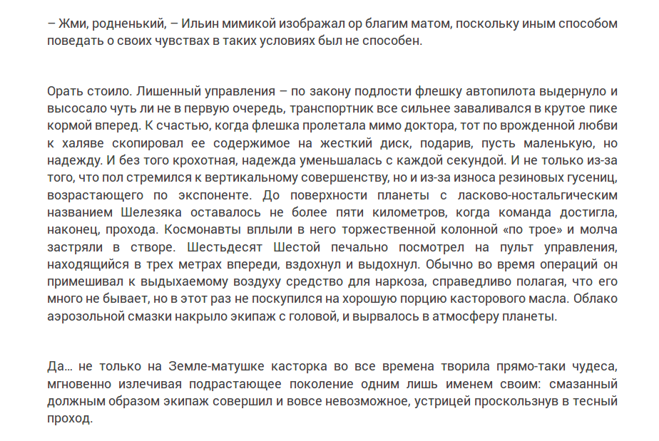 Да, сюжет тут очень космическо приключенческий. Но стиль рассказа а-а-а-а!! Я мрачный человек, я не могу ржать над гибелью мира. Причём, постоянно, без передышки и в одном и том же темпоритме, длине предложений и абзацей, в тех же выражениях постоянно, и снова, и опять... Хоть бы картинки повтыкали! И вот тут я поняла, почему там столь обширны дыры между абзацами — для создания ментально-выразительной тишины и краткого отдоновения в междустрочьи.