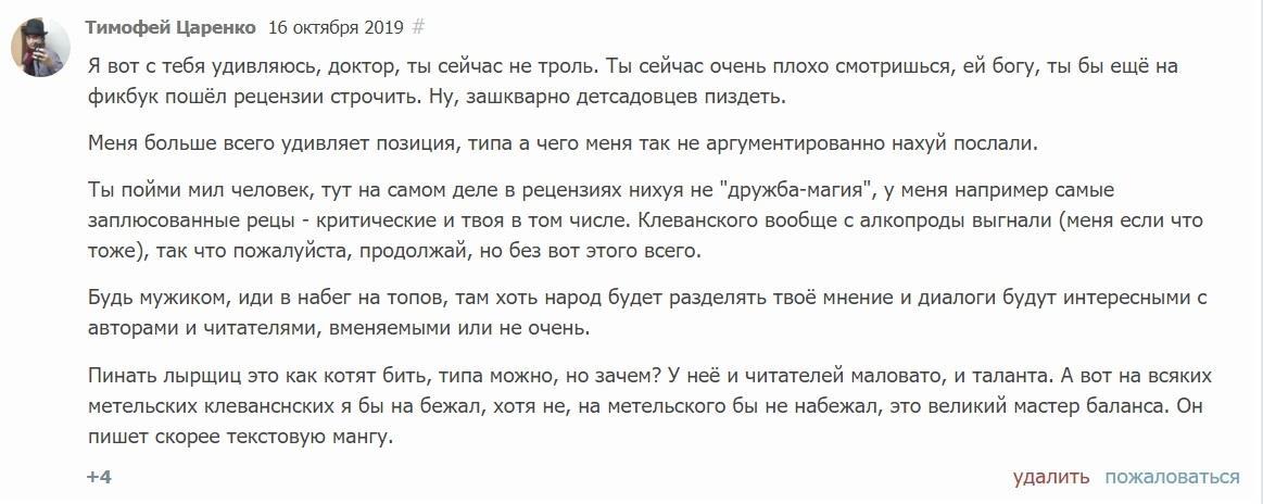 беда в том, что действия героев являются вариантом нормы в описанном Царенко обществе. в книге отсутствует какой либо конфликт, а через отсутствие конфликта становится невозможно осознание своих ошибок и моральное перерождение героев (катарсис).