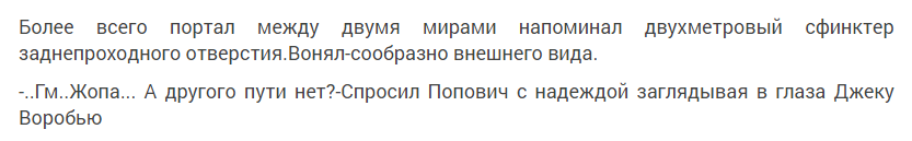 Стёбный театр абсурда, замешанный на сочетание несочетаемого и приданию всему этого подъездного, провинциального юморка. Джек Воробей играет в кости с домовыми, Алёша Попович дрючит в кустах Красную Шапочку, которую до этого оприходывало двое других не менее известных персонажей, Кащей открывает портал в Зону Отчуждения, а у Золушки в причинном месте спираль превращается в тыкву. И признаться, качество текста весьма на уровне сюжета. Вот прям ни хуже, не лучше, этакий Сектор Газовский, Красноплесненский говор, который отнють не у каждого способен вызвать симпатию.