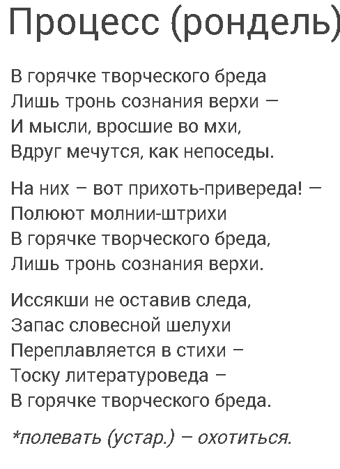 По сути же в «твёрдую форму» играть не так уж и сложно, скорее это такой этап «ученичества» для поэта – и то попробовать, и это, за это даже оценки ставить можно, и тут бы от меня была твёрдая или круглая пятёрка, но я эта… сам-то ни разу рондель не пробовал, сонет пробовал, лимерик пробовал, даже и центон пробовал, а рондель – неа.