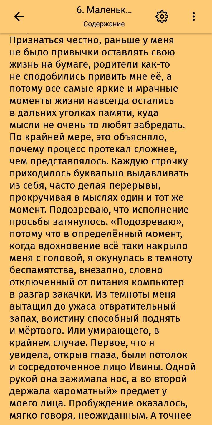 Пытаясь описать различные вещи и события, вы так сильно увлекаетесь, получая переборщенный текст, который скучно читать. Вот начнем с самого начала. С первой главы, где меня нашпиговали ненужной, для последующего повествования ПОДРОБНОЙ информацией о семейной драме главной героини. Мне подробно описали, что у нее был сожитель, который умер. Что все друзья дружили с ними из-за его материального благополучия, а как его не стало, просто пропали. Узнал, что родители главной героини поругались с ней, после его смерти. Родная сестра поссорилась с мужем и свалила к главной героине со своими отпрысками. И это нудное описание ее любви к библиотеке. Оно такое длинное, что к концу описания, ловишь себя на мысли, что мозг просто отключается от всего описанного, выхватывает лишь нужные ему детали, а вот глазам не везет, они вынуждены читать весь текст целиком и полностью. 849 194 знаков. Из них смело можно отбросить половину, так как они не информативны, отвлекают от действия. Да, я понимаю, что вы начинающий писатель, что вам хочется поделится с миром всем, что накопилось в ваших фантазиях. Не надо. Мир к этому еще не готов. Постарайтесь сдерживаться, все хотят знать суть, без излишней лирики. И да, вы можете ссылаться на название книги, мол, там же ясно написано, что это «дневники». Нет. Это, в первую очередь художественное произведение, которое должно заинтересовать читателя, а не стать для него акыном, с девизом по жизни – «что вижу, то пою». Почитайте дневники Астрид Лингред; не знаю, может они и прошли редакцию в издательстве, но в них нет лишних описаний ненужных перипихов судьбы. Посмотрите книгу Брэма Стокера - готический роман «Дракула». Оно полностью построено на записях в дневниках и письмах главных героев. Посмотрите книгу Густава Майринка – «Ангел западного окна», о записях средневекового ученого Джона Ди. Да, роман насыщен алхимическими, тантрическими и каббалистическими мифологемами и нужно быть знатоком этих вещей, чтобы разобраться в сюжете, но посмотрите на его слог:
