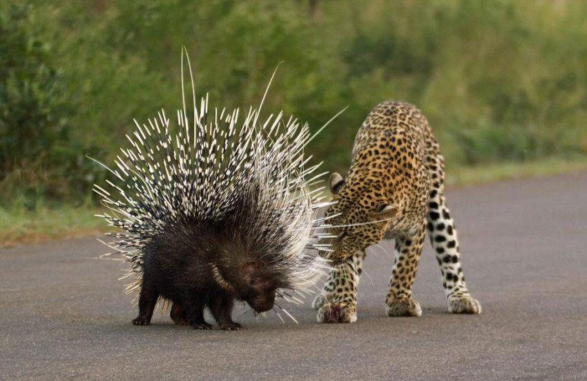 Фотки дикобраза рядом с человеком не нашел, но вот для сравнения: дикобраз рядом с… леопардом, кажется.