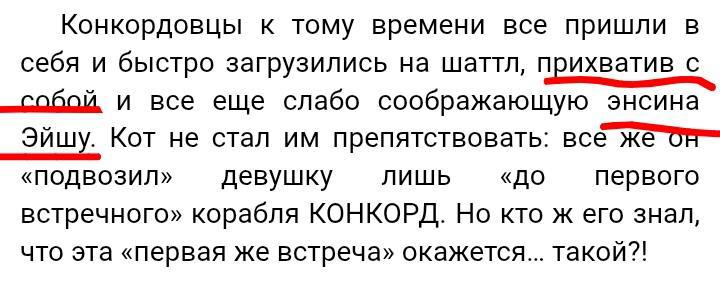 Ну, можно добавить типа: "Конкордовцы к тому времни немного пришли в себя и загрузились на шаттл. Воспользовавшись общей растерянностью (пришибленностбю), энсин Эйша незаметно скользнула в проход (люк), ведущий вглубь корабля.