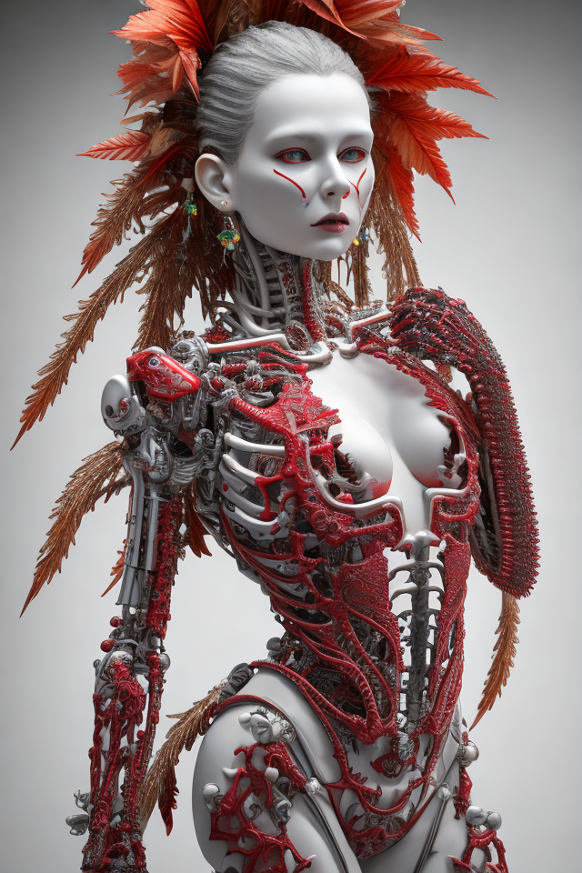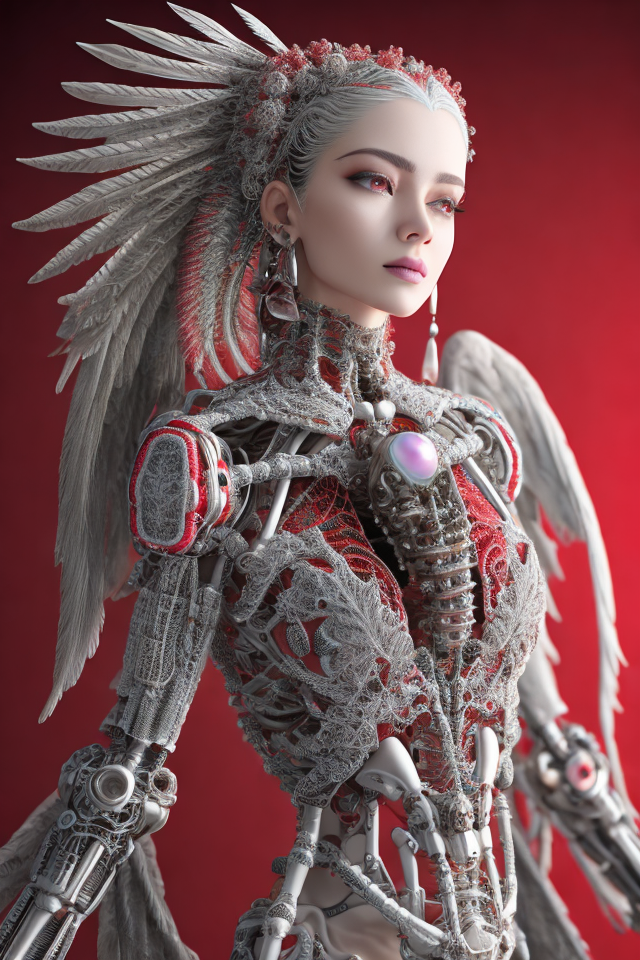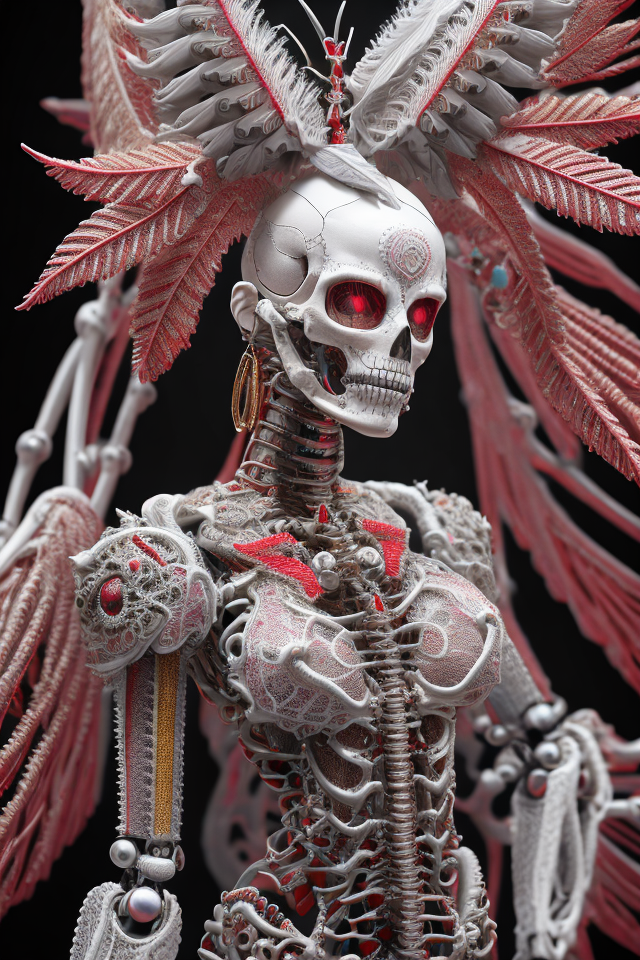 complex 3d render ultra detailed beautiful death angel, biomechanical cyborg, analog 150 mm lens, beautiful natural soft rim light, big leaves and stems, roots, fine foliage lace, colorful details, Boris Bidjan Saberi outfit, pearl earrings, piercing, art nouveau fashion embroidered, intricate details, mesh wire, mandelbrot fractal, facial muscles, cable wires, microchip, badass, hyper realistic, ultra detailed, octane render, volumetric lighting, 8k post-production, red and white with a bit of black, detailled metalic bones, semi human, iridescent colors, Glenn Brown style, white room, power of the god, high-angle shot, complex body poses