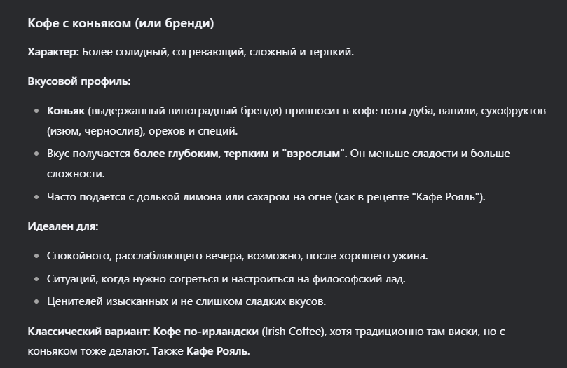 Если вы предпочитаете крепкие, терпкие и сложные напитки с долгим послевкусием — ваш выбор кофе с коньяком.