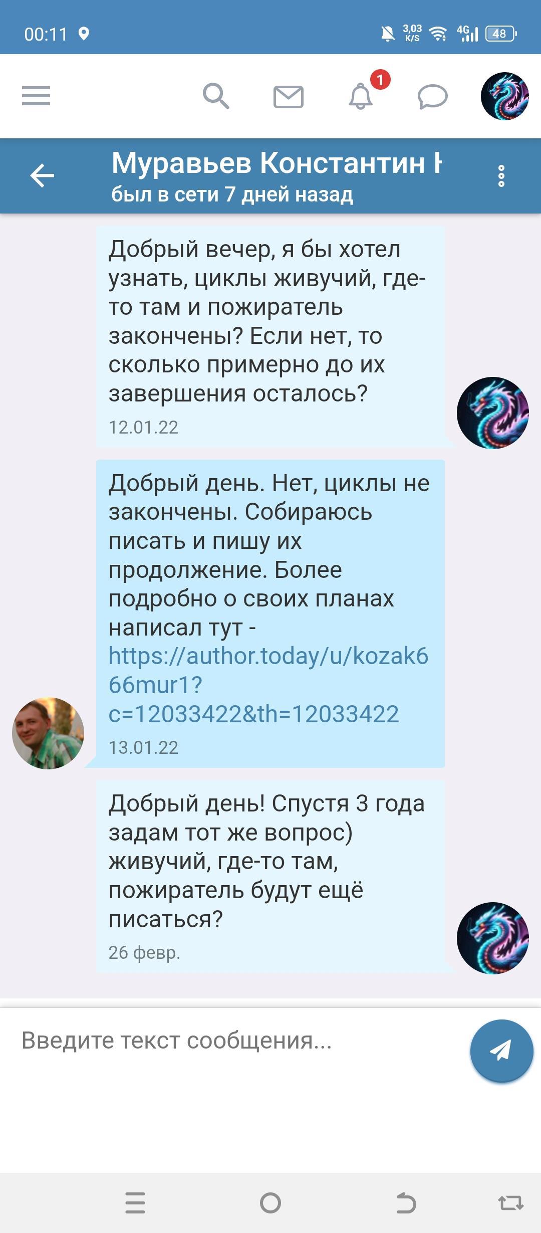 Дата 17 декабря 2025 года, время 00:04, 3 года ровно прошло с выкладывания этой книги. Если не ошибаюсь, я начал читать книги этого автора с 2020 года с живучего и где-то там, потом автор начал писать пожирателя. И вот с 20 года жду завершения первых циклов, с 21 жду пожирателя. Но вот думаю что все мы ждем бессмысленно, прод не будет, проще создать аккаунт и самим написать проду. Автор даже на сообщения и комменты не отвечает