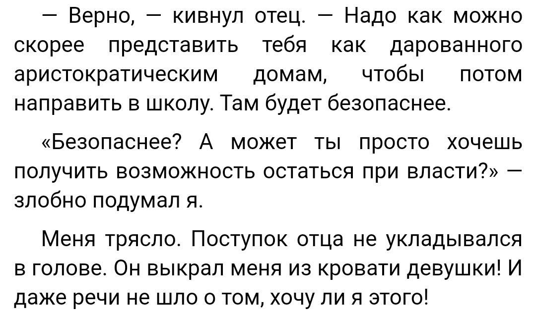 Гг- инвалид в прошлой жизни. Но как только попадает в здоровое тело превращается в пацана- спермотоксикозника. Он ВООБЩЕ не думает о своих поступках. Пока что гг меня отталкивает, он же даже не задумывается: "А почему отец хочет остаться у власти?" но при этом хочет жить в роскоши и ничего не делать. Его же выкрали из кровати девушки, о боже! Но он напрочь забыл, ЧЬЯ это девушка. Я всё понимаю, реалистичность и т.д. Но он же инвалид, читал много книг, активно умственно развивался. Где его умственное развитие- то?