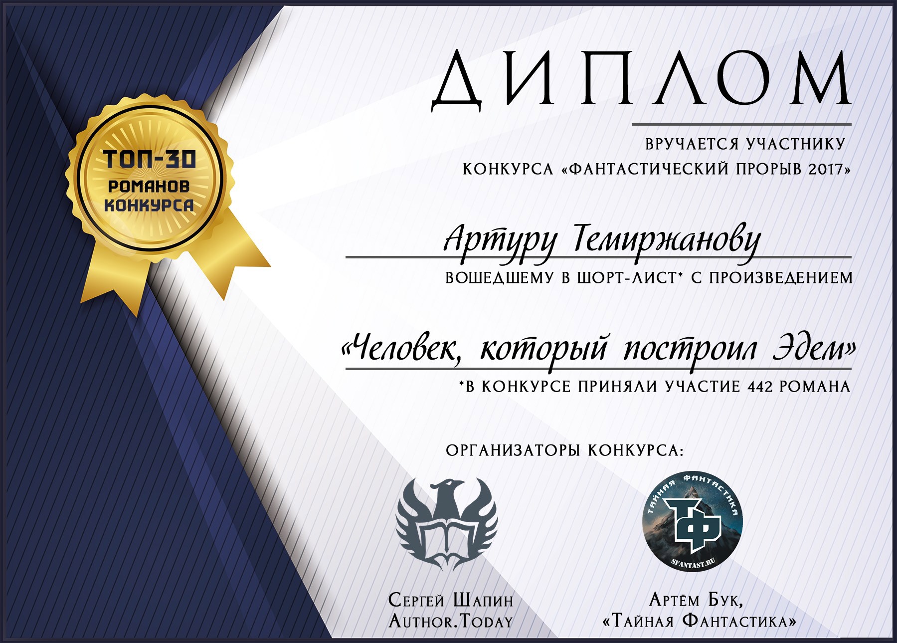 За роман «Человек, который построил Эдем», победивший в номинации «Приз читательских симпатий» на конкурсе «Фантастический прорыв 2017»