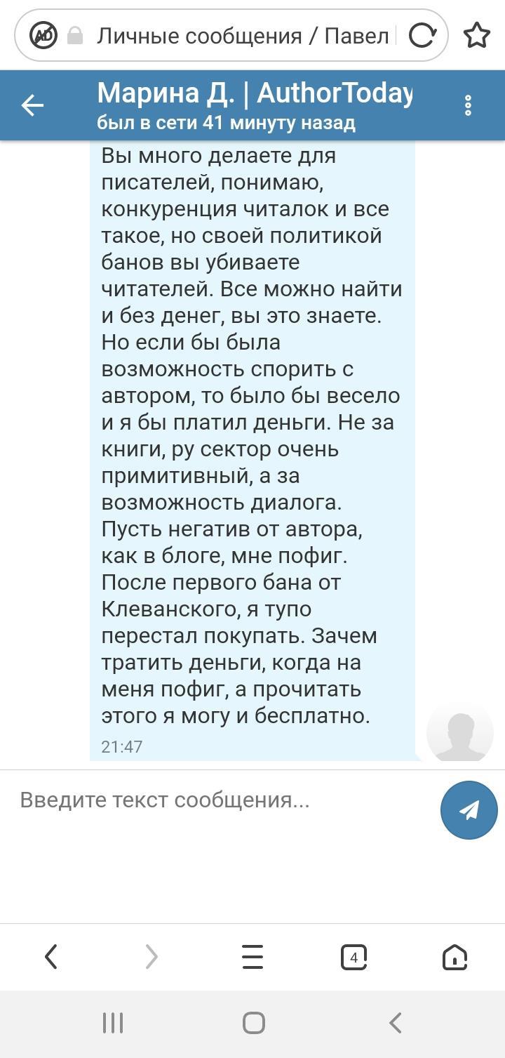 Да не буду я ничего отписывать, я хотел про бан, про ЧСВ, про великое ЧСВ, то которое слишком. Даже тут - итог в бан. Господа авторы. Да не скушаю я вашу конфетку. Кому она нужна. Читать ваши книжки на 600 стр, когда есть рэнобе, с которого... ну да ладно, я почитаю шедевры на 25к стр.