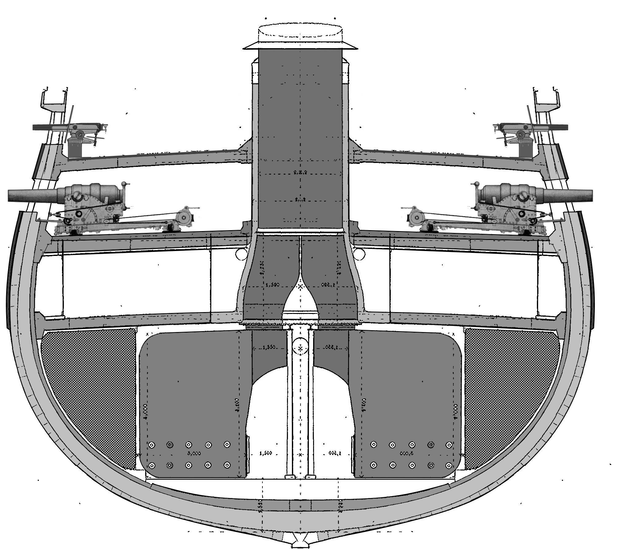 На данном и ближайшем периоде времени до появление мощных фугасов 6-ти дюймовки не нужны. У фугасов на дымном низкая эффективность, по железу почти нет разницы фугасом или болванкой зарядили. Поэтому БК долго строили только с главным калибром, и по схеме все или нечего. Вот что уже нужно сейчас, так прортивоминный калибр, с стой разницей из-за того что миноносцы оснащенные шестовыми минами ближайшие лет пятнадцать будут крупными кораблями (от 200 т и больше) против них нужна скорострельная артиллерия от 60-мм и выше.