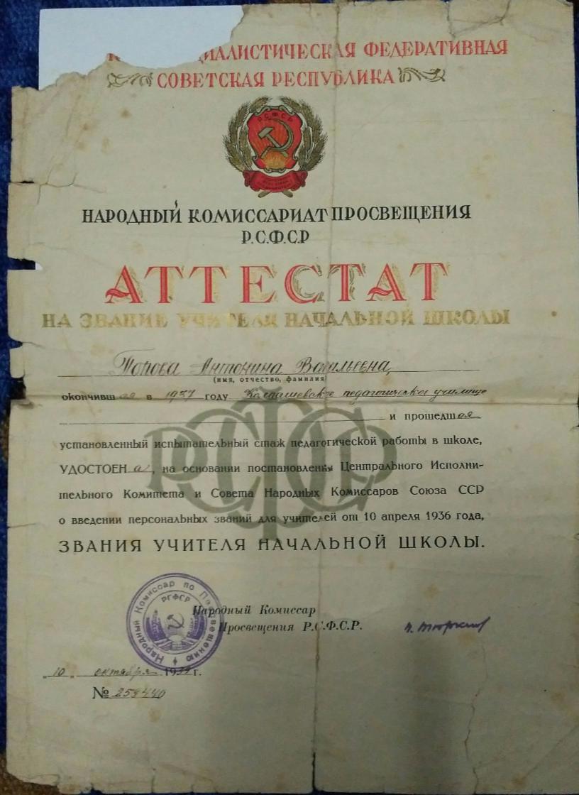 Нашел в интернете вот это: женщина, уже проработавшая учителем чере какое-то врем получила аттестат наркомата Просвещения о присвоении ЗВАНИЯ учитель начальной школы