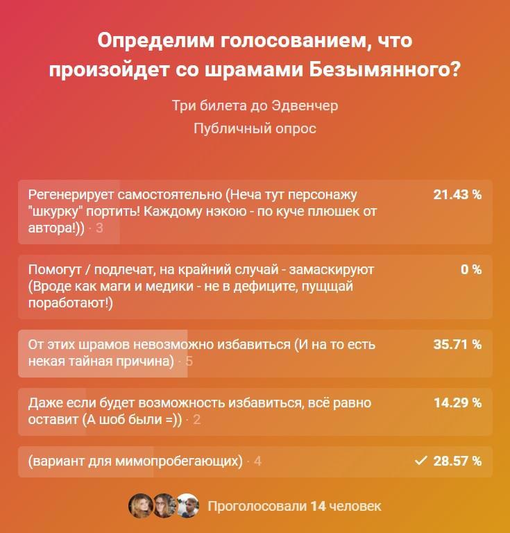 А вот и результаты одного из голосований) Ценю ваш выбор, дамы и господа, и обязательно использую его в сюжете!