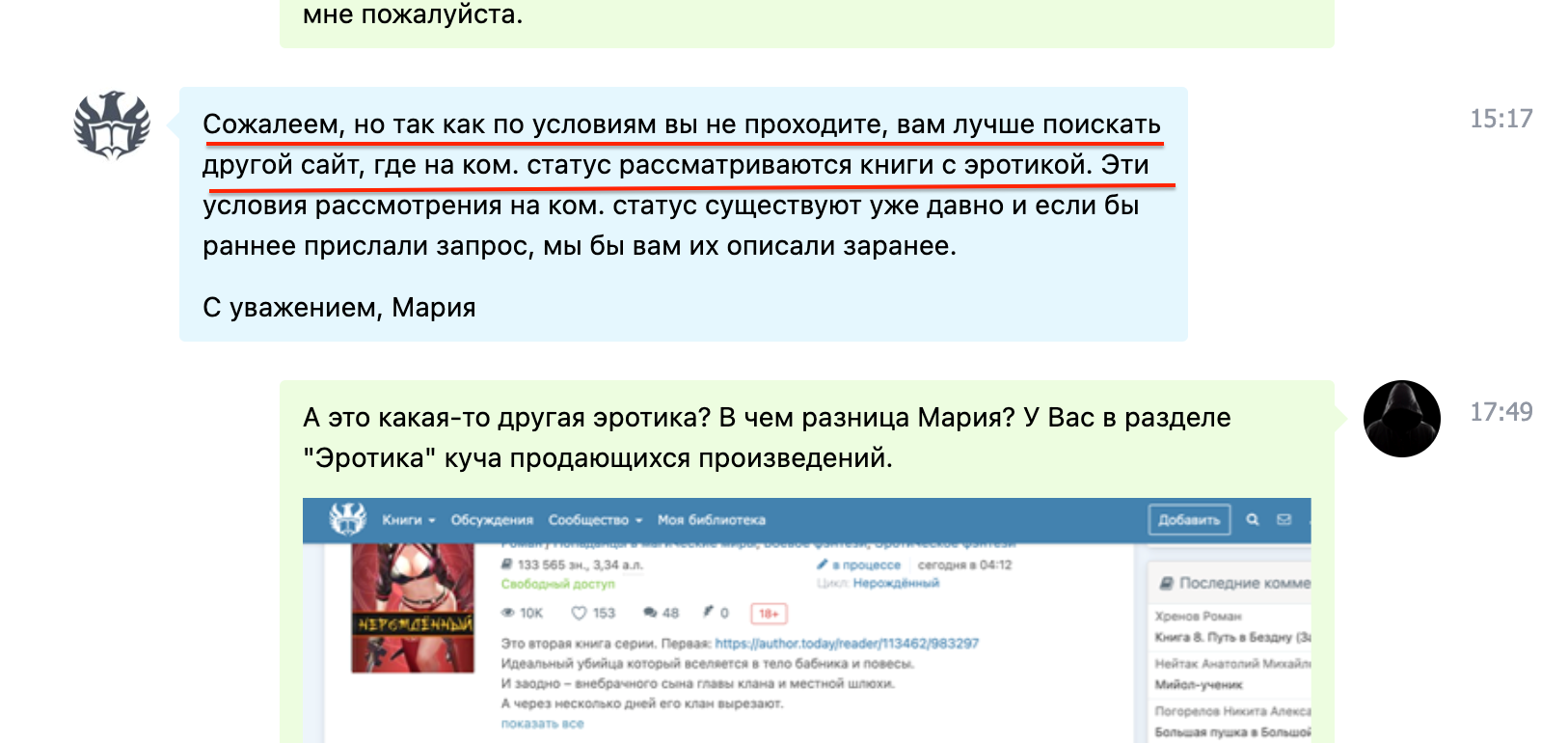 - для получения коммерческого статуса надо сначала написать "не эротическое произведение".