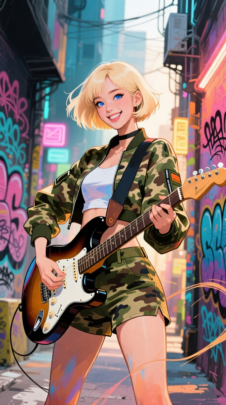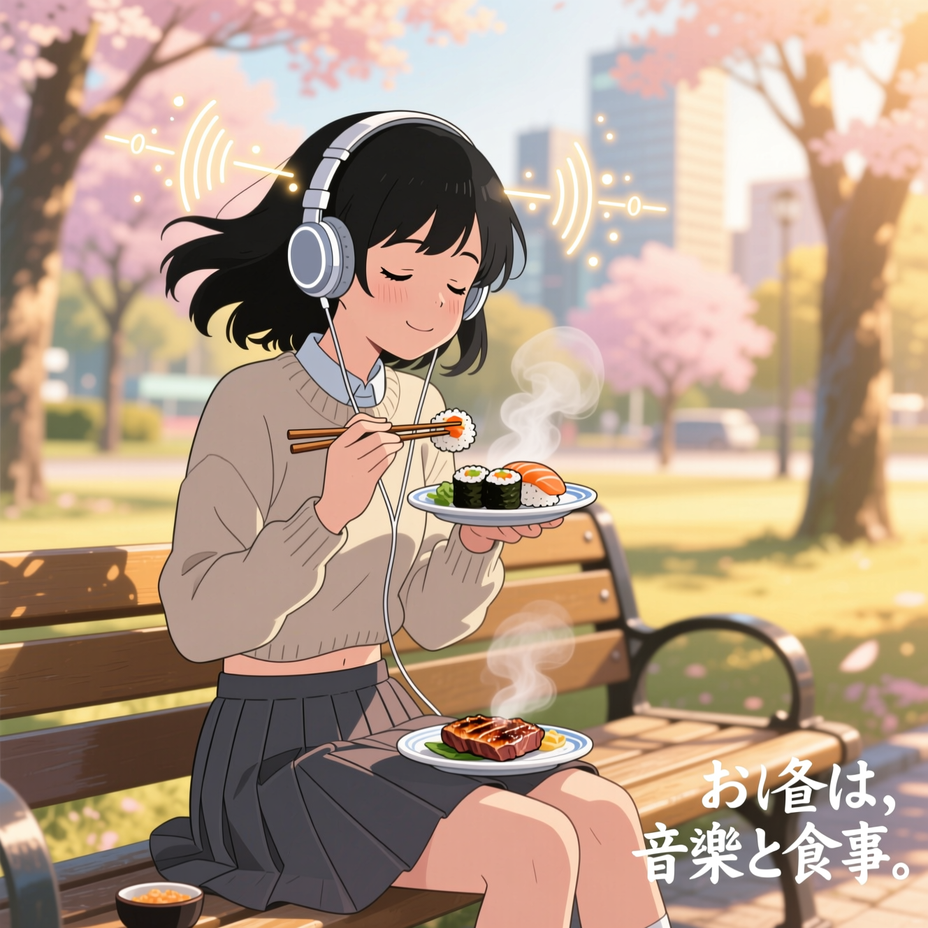 На заднем плане Токио Доум с афишей, на которой изображена Девушка inspired Korean Idol Jeongyeon from TWICE с короткой стрижкой пикси и голубыми глазами играет на синтезаторе Korg.