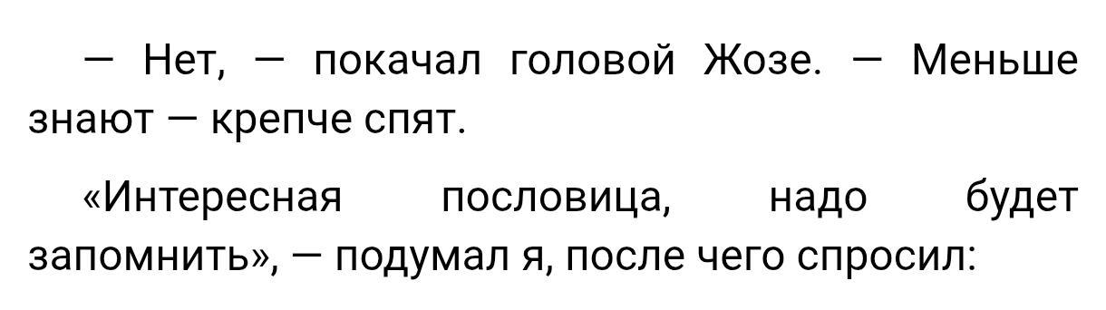 Автор в 22й голове Жозе сказал меньше знаешь крепче спят и гг подумал что поговорка хорошая и надо будет ее запомнить но прошлой или позапрошлой книге гг сам использовал эту поговорку а тут реакция как будто он сам впервые услышал подобное выражение причем реакция была мысленная поэтому явно не притворная вообщем по моему эта ошибка куда серьезнее опечаток