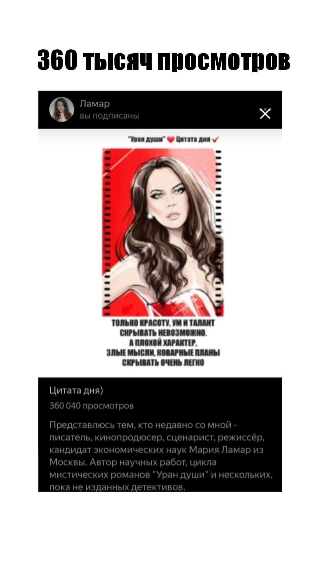 Автор самой популярной цитаты российского современного автора в 2020 г. в Яндекс. Цитата: "Только красоту, ум и талант скрывать невозможно. А плохой характер, злые мысли, коварные планы скрывать очень легко" (360 тысяч просмотров видео с цитатой).
