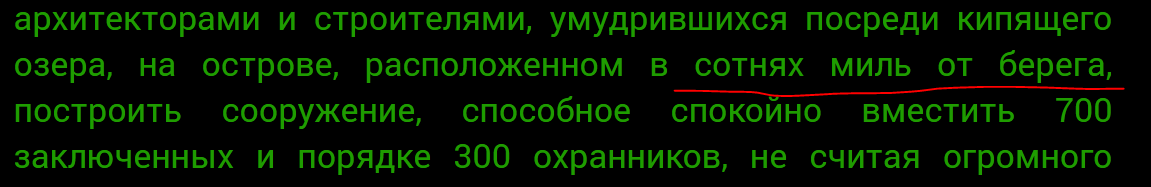 это кипящая скала, остров как я понимаю являющийся жерлом вулкана, и в жерле вулкана кипящее озеро посреди которого сама тюрьма. при прочтении я подумал что сотни миль относятся к озеру с кипятком.