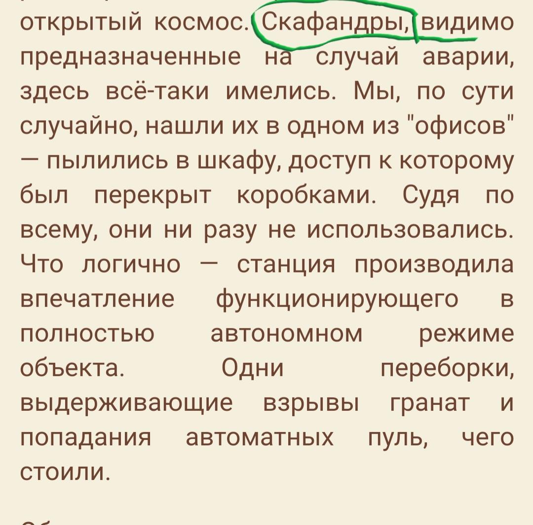 Скафандры в раздвижной стене на отсеках. Просто ГГ не заметил их. Они там есть реально