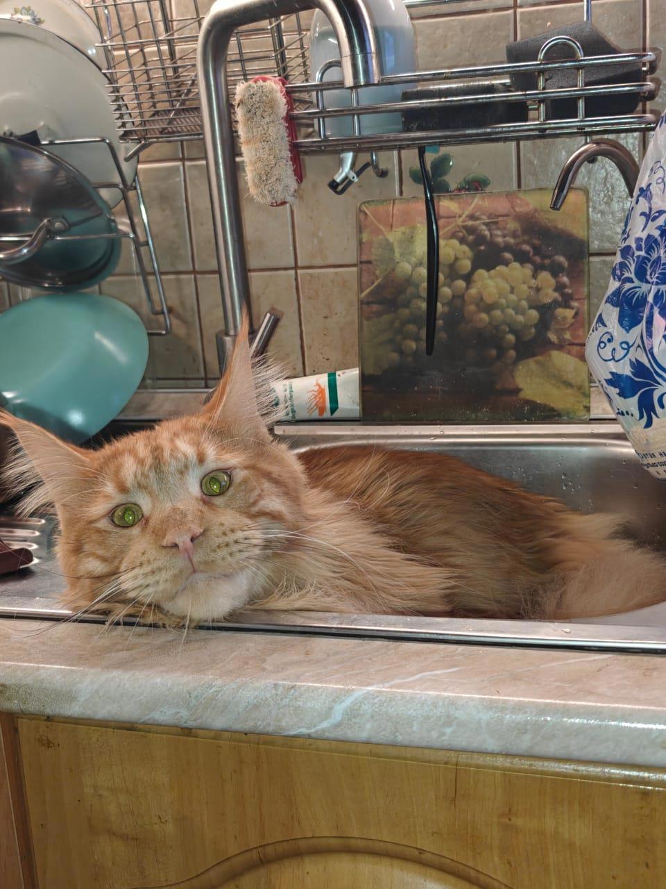 У нас годовалый мейнкун, 8 кг. Ест сухой корм специальный, для мейнкунов. Но не пачку, грамм 200. Еще пакетики любит, и кошку, норвежскую лесную, пытается объесть все время. Чужой корм вкуснее. А когда пьет, копает, да. Они все копают,перед тем как напиться.
