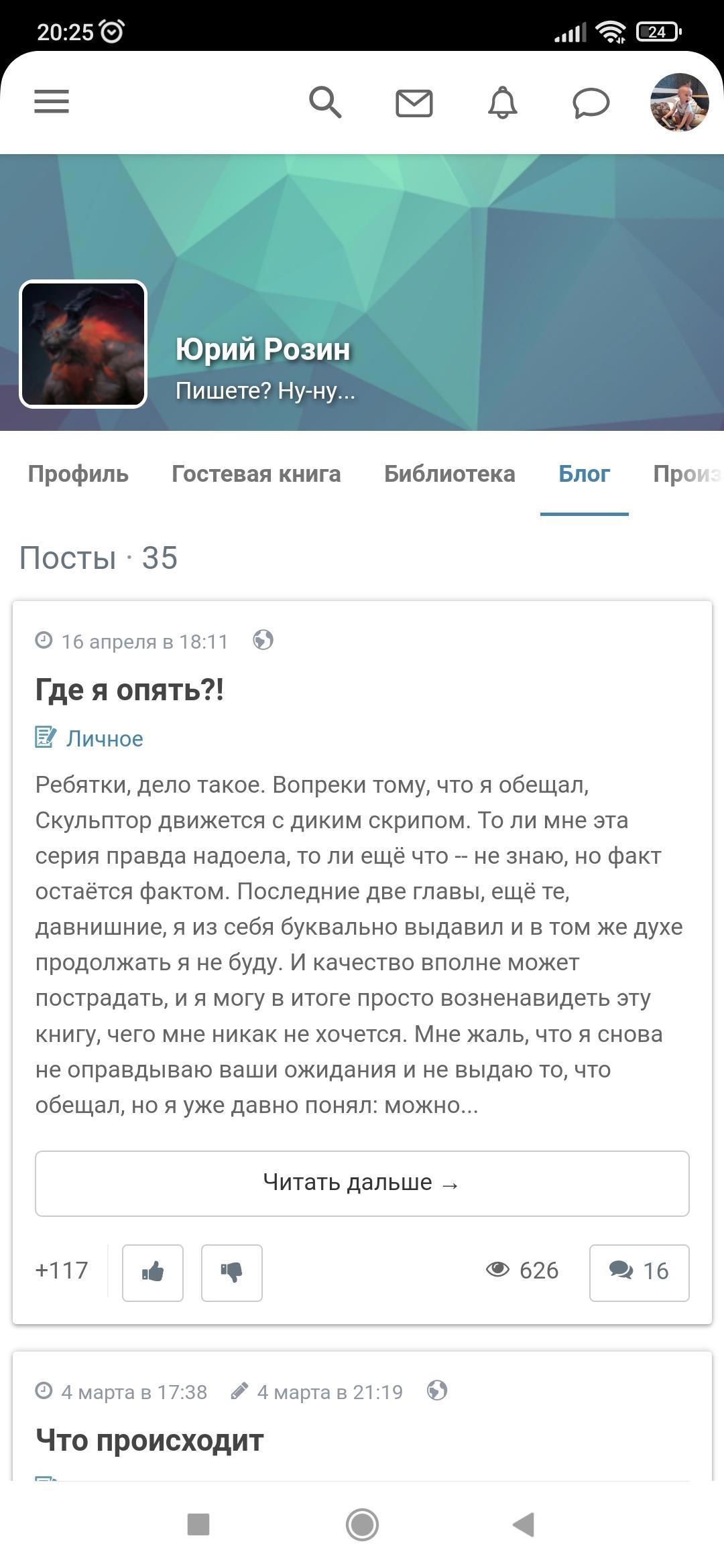 "Ребятки, дело такое. Вопреки тому, что я обещал, Скульптор движется с диким скрипом. То ли мне эта серия правда надоела, то ли ещё что -- не знаю, но факт остаётся фактом. Последние две главы, ещё те, давнишние, я из себя буквально выдавил и в том же духе продолжать я не буду. И качество вполне может пострадать, и я могу в итоге просто возненавидеть эту книгу, чего мне никак не хочется. Мне жаль, что я снова не оправдываю ваши ожидания и не выдаю то, что обещал, но я уже давно понял: можно себя подталкивать, но принуждать не стоит, только боком выйдет.