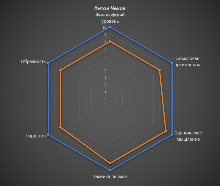 Если я правильно понимаю, то речь идёт о соотношении показателей разных категорий. Например, к внешнему периметру ближе линия "Смысловая архитектура-Сценическое мышление". Это означает, что автор не просто грамотно расставляет действующие лица в сцене, но вносит смысл в действие, в расстановку, окружение и так далее. Не обязательно всё вместе, но в сценах этого автора будет иметься более глубокая смысловая насыщенность.