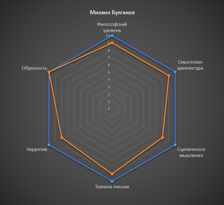 С одной стороны, графики показывают технические способности автора в конкретных категориях. Но я бы не сказал, что Эко сильнее Булгакова. У первого сильнее философская составляющая и более глобальные смысловые конструкции. Но образность языка, сценическое мышление у Булгакова лучше. Смысловая архитектура сильная, но подаётся в немного более простых конструкциях, текст легче. Потому и читается по-другому.