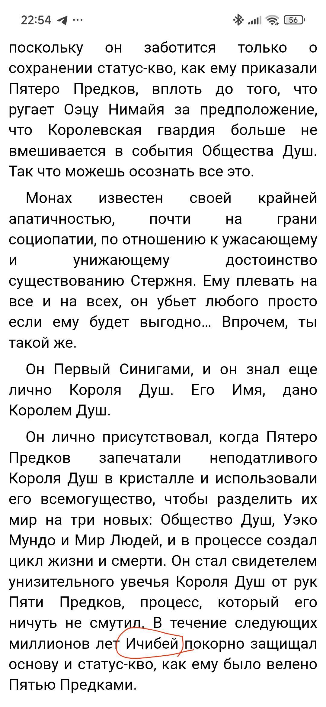 Хм очень хорошая глава последняя вышла....но мне правда в целом вся эта арка Очень не нравится) одна из самых для меня нелюбимых и тупых в оригинале .. но в целом со всеми этими проблемами мне кажется Ичиго скоро эти "союзники" так задолбут что он сам придёт к Айзену с вопросом а так ли ему для ключа короля надо жителей Каракуры в жертву принести....может для этого подойдут и синигами готей 13 с благородными кланами? Ибо в таком благом деле как уборка этого мусора он даже будет не против помочь